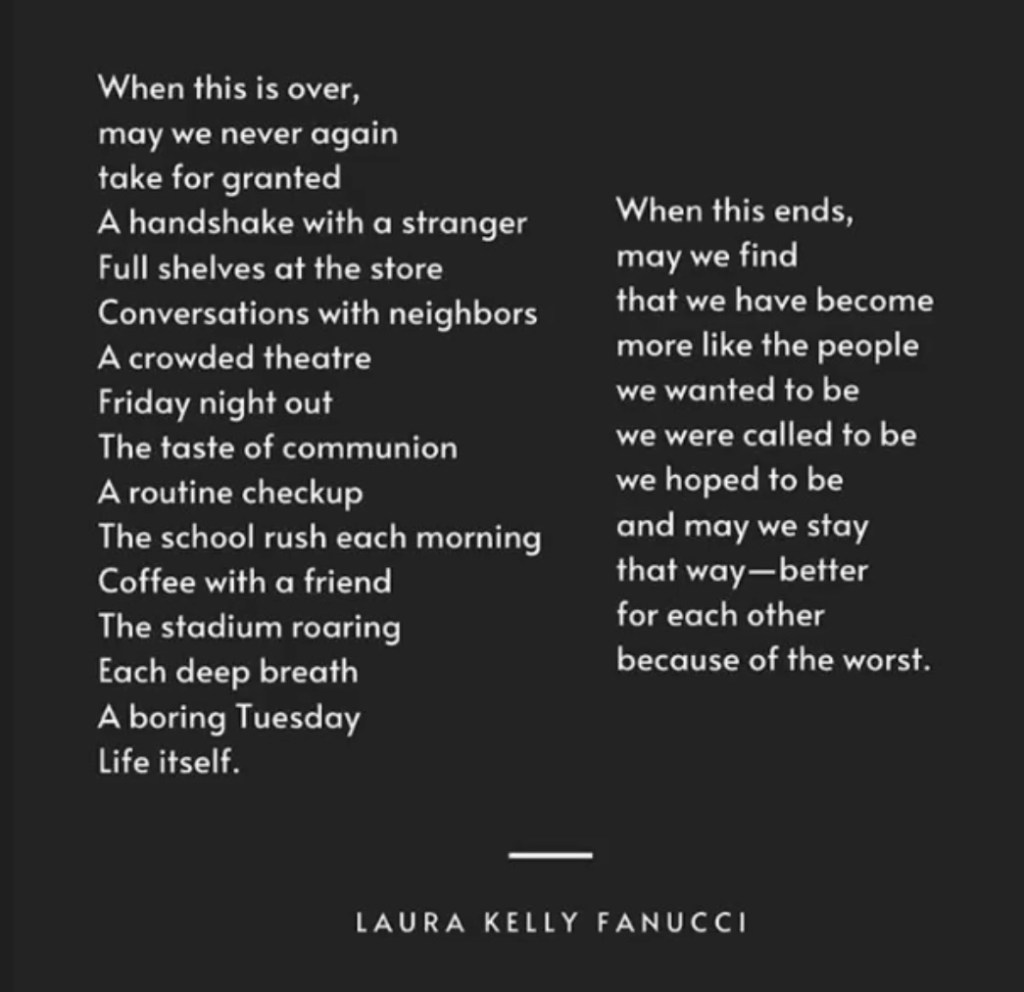 This virus is affecting all of us in so many similar & different ways. I worry for all those that are unemployed & suffering financially. I worry for all the seniors and all those with compromised immune systems. I worry for all the first responders & medical personnel. I worry for all those who are now experiencing depression. I worry for all of us whose lives have been unimaginably disrupted. This has taken its toll on all of us whose lives are now on hold. I am heartbroken for all the families who have lost loved ones. 🙏💖