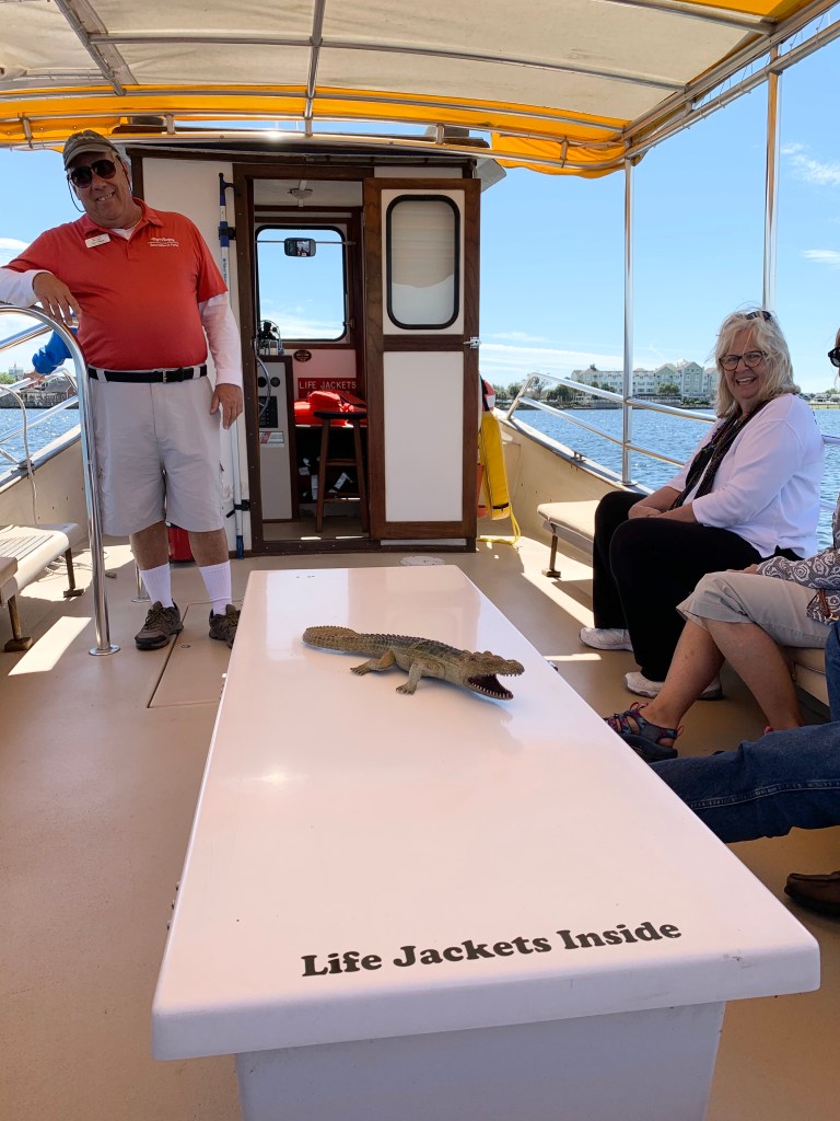 Yesterday Kim & Michele came to my resort to pick me up. We headed to Lake Sumter Landing in The Villages. We met up with their friends, Bob & Cathy who gave us an abbreviated tour of the town square. We hopped on a boat for a $2 twenty minute tour of man made Lake Sumter. Our tour guide told us about the 20 active alligators in the lake then proceeded to throw a fake one on the life jacket box, of course he scared the crap out of me ! 😳 We then headed to Gator Dockside for drinks & lunch. Afterwards, Michele went shopping while Bob, Kim & I searched for an ice cream treat.