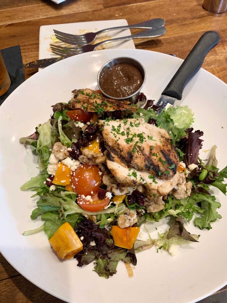 Today I met Kim & Michele at the RusTeak Restaurant & Wine Bar in Ocoee. We enjoyed Kung Pao Cauliflower while waiting on our entrees. Kim & I both had blackened chicken over Kale with shaved Brussels sprouts, candied walnuts, cranberries, cherry tomatoes, feta cheese & butternut squash with spiced fig vinaigrette. Michele enjoyed a ribeye with cauliflower & cheese pancetta casserole & broccolini. Another delicious meal in the books !! Michele shared her leftovers with Sadie, photo shows Sadie anxiously waiting for some ribeye for dinner !