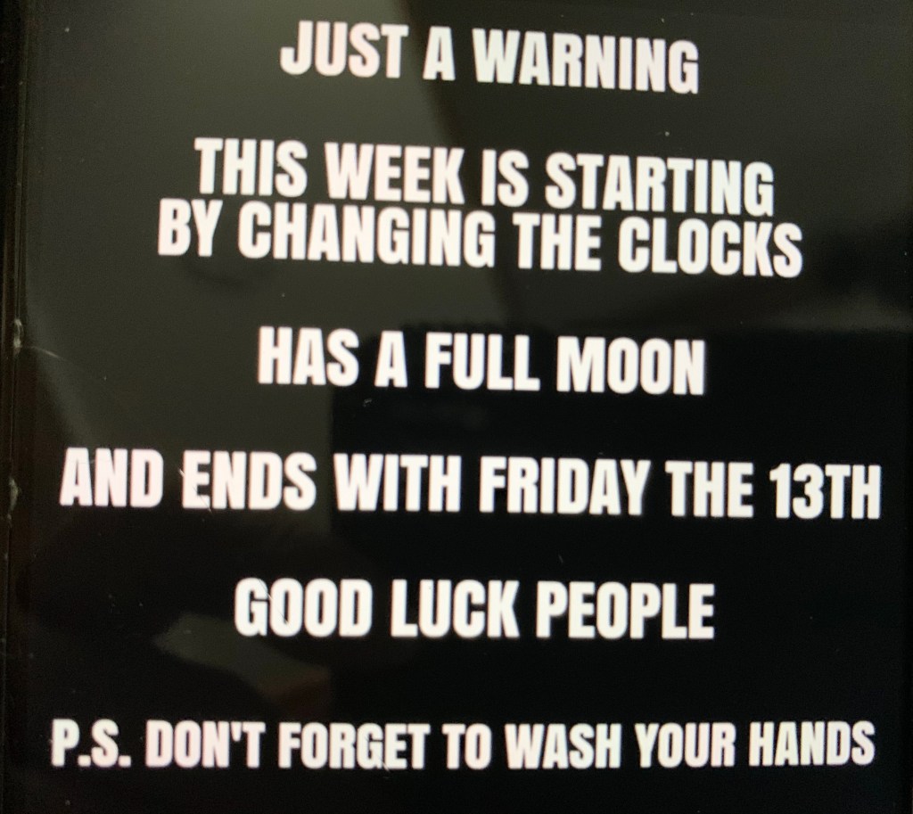 As a side note, it’s been 13 days since Sadie’s surgery. Tomorrow her stitches are finally removed. She is definitely feeling better! I had to share a Daylight Savings Time morning photo of Sadie as well as something funny I saw on social media. Take a peek outside tonight … The full worm moon is spectacular.