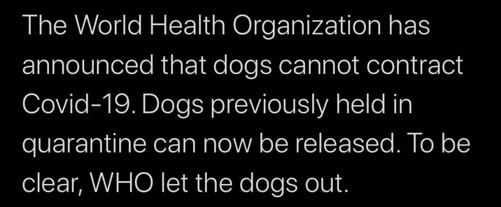 Sadie & I send all our friends our love. We pray that you all stay healthy during this insane CoVid19 pandemic. I just saw an announcement that The World Health Organization stated dogs are safe from catching this virus … Alleluia !!