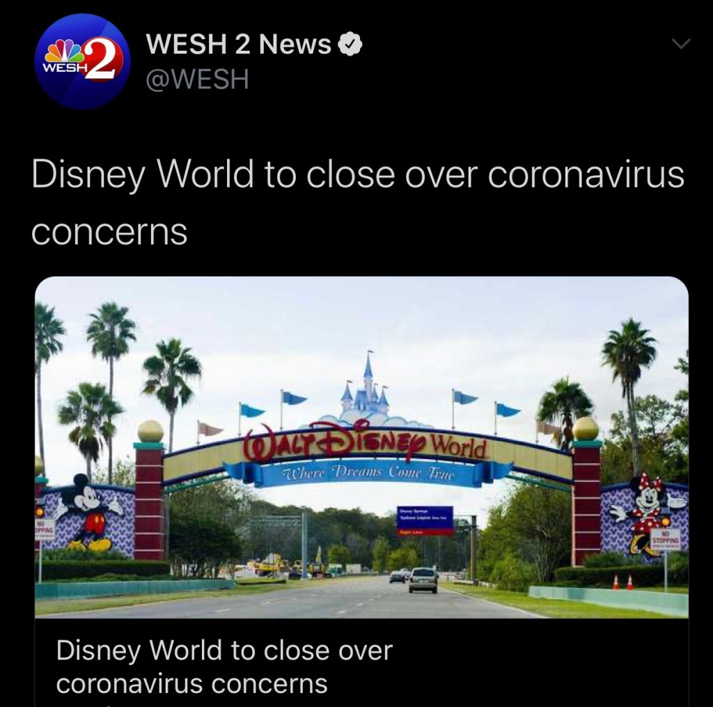 Broadway is shut down, last time was 9/11. Theme Parks are temporarily closing … Disneyland & Universal CA announced closure earlier today & now Disney World in Orlando just announced it will be closing this Sunday. They have only ever closed for a hurricane. Universal Orlando is closing. I am sure Sea World will be next. Flying is not recommended for those with health issues & the elderly.