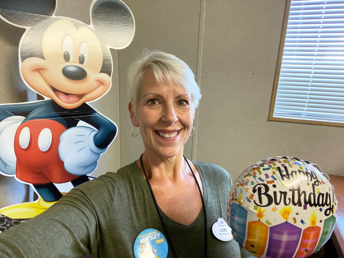 This past Monday was a very big deal here at Disney. It was Mickey & Minnie’s 91st birthday!! Every cast member & guest that attended a park was given a special commemorative pin! Happy Birthday M&M!! A very nice camping neighbor gave me a pin. My friend Lori, who happens to be a cast member also received a Mickey cardboard cutout & balloon that now adorn her office.