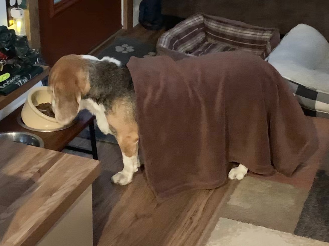 Pic 7 – When your beagle is so hungry and can’t wait to eat breakfast that she walks to her bowl with her blankie still on her! 🤣