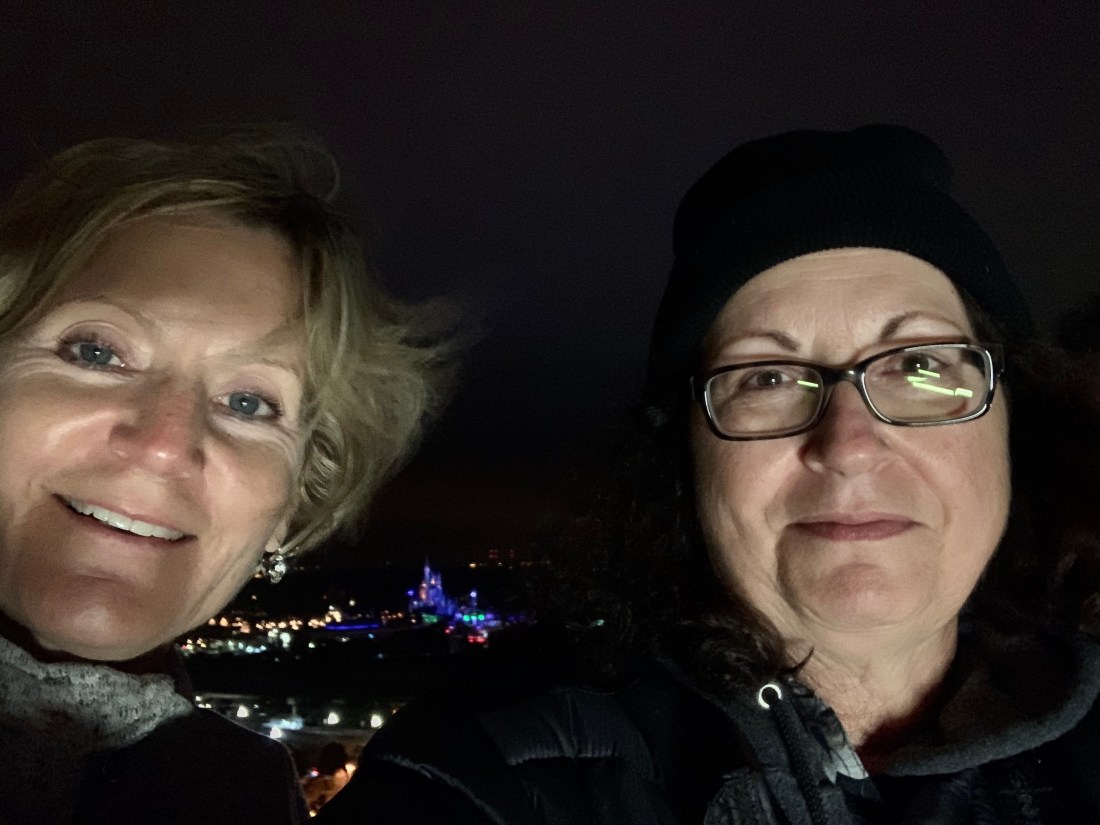 It was a bit (lots) chilly yesterday so we were in search of a hot beverage. We went to the Contemporary’s California Grill bar on the 15th floor (all guests are escorted to the restaurant via an elevator attendant). We ended up ordering coffee & a personal pizza to share. The Joffrey’s brand house blend coffee was the best French pressed that we ever tasted ! The thin crust wood fired pizza topped with 4 cheeses and a pesto swirl was equally delicious !! We were informed by the wait person that we could return to see the Magic Kingdom fireworks at 8pm as long as we showed our receipt to the elevator attendant.